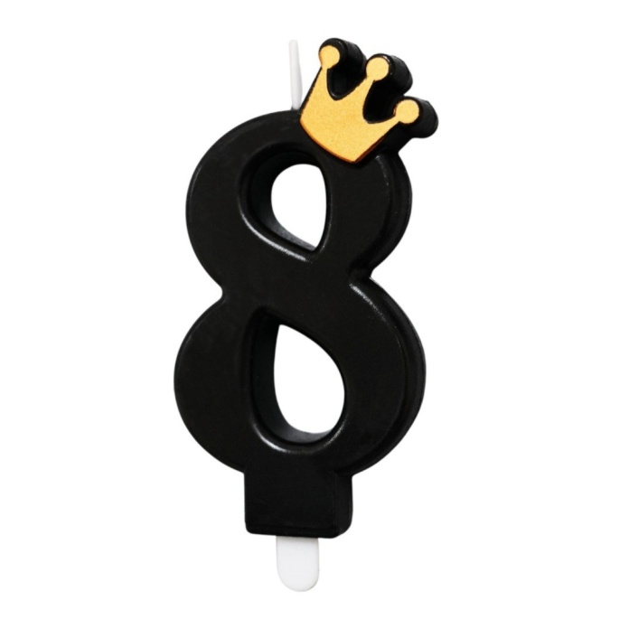 Świeczka w kształcie cyfry 8 w eleganckiej czerni, ozdobiona złotą koroną, to stylowy akcent każdej urodzinowej dekoracji. To doskonały wybór na przyjęcie dla małego lub dużego jubilata / jubilatki, którzy uwielbiają błysk i wyjątkowe detale.