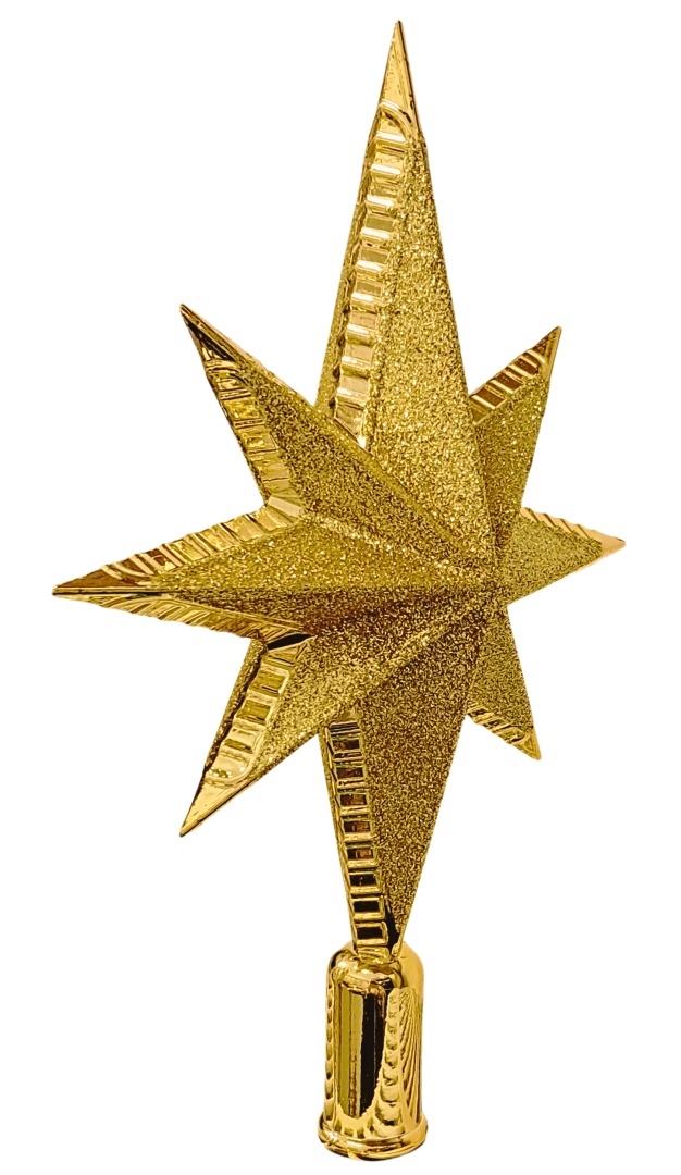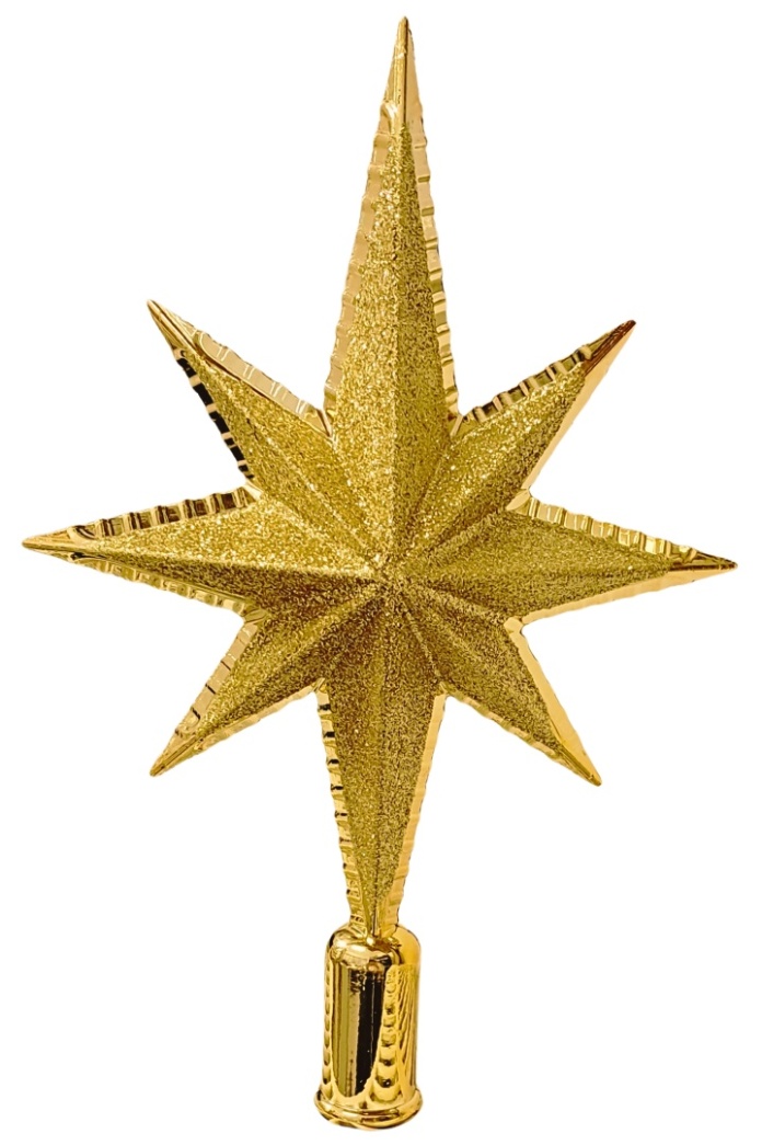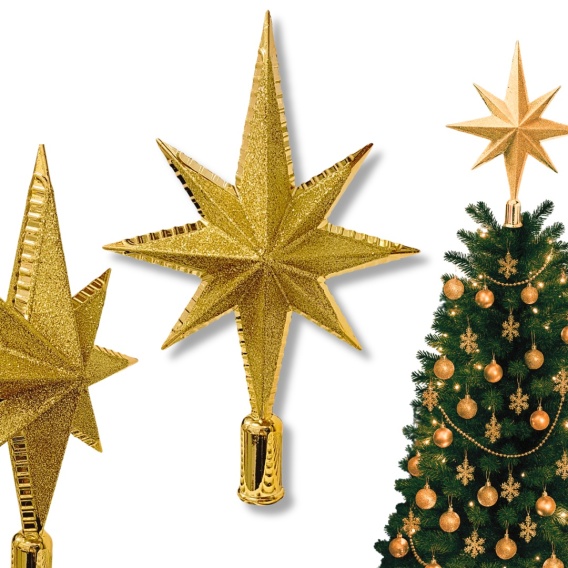 Ta elegancka złota gwiazda na czubek choinki to prawdziwa ozdoba premium, która odmieni wygląd każdego świątecznego drzewka. Błyszczące wykończenie i bogata warstwa drobnego brokatu sprawiają, że gwiazda pięknie odbija światła choinkowych lampek, tworząc wyjątkowy, świąteczny blask. Wykonana z trwałego plastiku – lekka, bezpieczna i gotowa, by zdobić choinkę przez wiele sezonów.