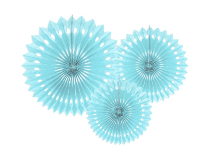 Jasnobłękitne rozety dekoracyjne to elegancka i subtelna ozdoba, która wprowadzi klimat spokoju i radości do każdej uroczystości. Idealne na wesela, baby shower, chrzest, roczki czy przyjęcia w stylu boho i pastelowym.