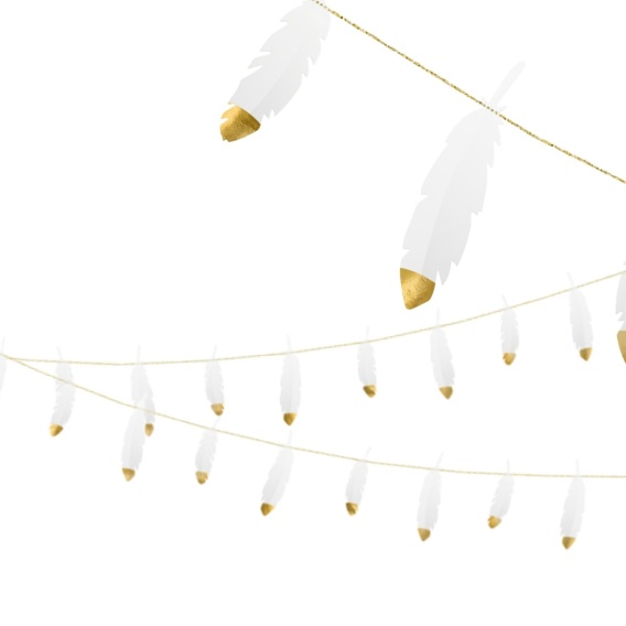 Chcesz, aby Twoje przyjęcie zyskało subtelną i elegancką oprawę? Postaw na girlandę piórka w bieli ze złotymi końcówkami! 🤍✨