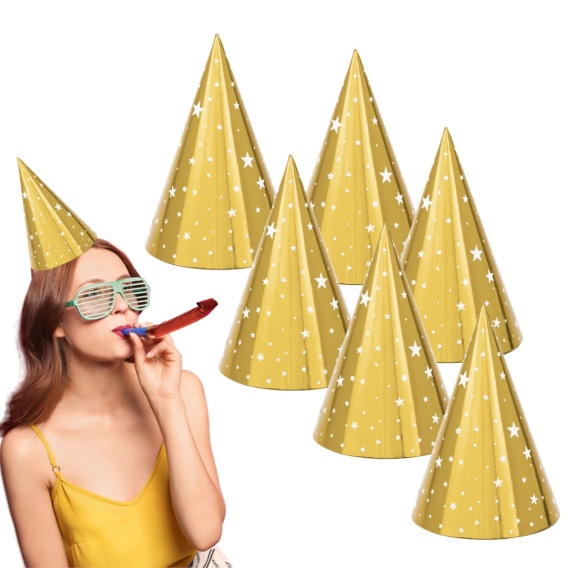 PAPIEROWE CZAPECZKI ZŁOTE W GWIAZDKI 6sztuk CZAPECZKI URODZINOWE