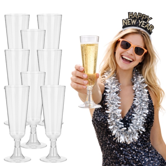 Plastikowe kieliszki do szampana o pojemności 150 ml to praktyczne i estetyczne rozwiązanie na przyjęcia, eventy i uroczystości okolicznościowe. Smukły kształt oraz przezroczysty materiał doskonale imitują klasyczne szklane kieliszki, jednocześnie zapewniając bezpieczeństwo i komfort użytkowania. Idealne do serwowania szampana, prosecco oraz innych napojów musujących.