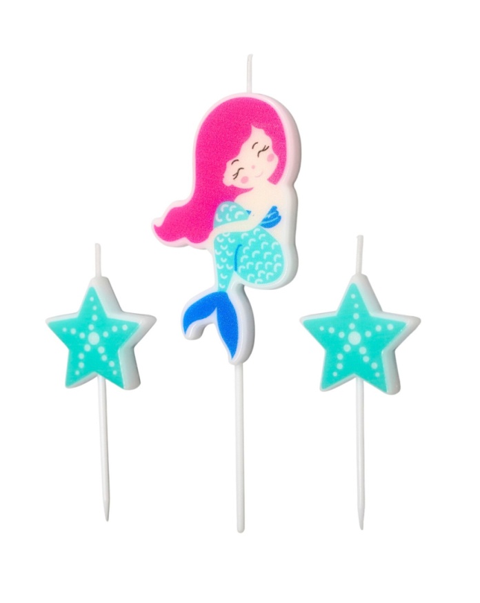 Zestaw świeczek z motywem syrenki i rozgwiazd to urocza dekoracja, która przeniesie każde przyjęcie do bajkowego świata oceanu. Idealna na urodziny małej miłośniczki morza, kolorów i fantazji. Delikatne pastelowe barwy i uśmiechnięta syrenka sprawią, że tort nabierze wyjątkowego, bajkowego uroku.