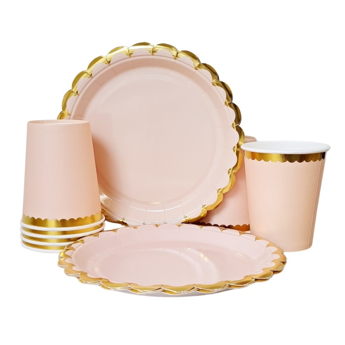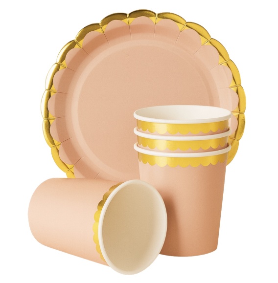 Zestaw papierowych kubeczków i talerzyków w odcieniu nude ze złotą falbanką to idealny wybór dla osób, które chcą połączyć wygodę z wyjątkową estetyką. Delikatny, neutralny kolor z połyskującym złotym akcentem sprawia, że komplet doskonale komponuje się zarówno z klasycznymi, jak i nowoczesnymi aranżacjami stołu.