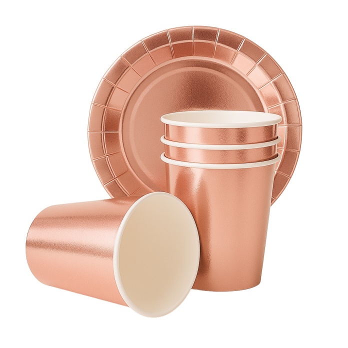 Zestaw papierowych kubeczków i talerzyków w kolorze różowego złota, metalizowanym to idealne rozwiązanie na przyjęcia, urodziny, wesela czy eventy firmowe. Połyskujące wykończenie nadaje aranżacji nowoczesnego charakteru, a jednocześnie pozwala zachować wygodę jednorazowego użytku.