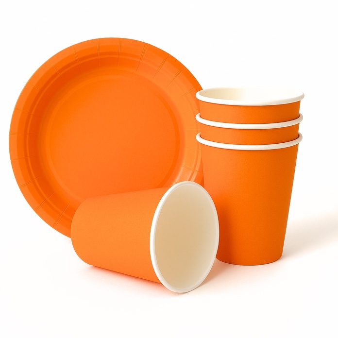 Stwórz radosny i wyrazisty klimat przy stole z naszym pomarańczowym zestawem naczyń papierowych!